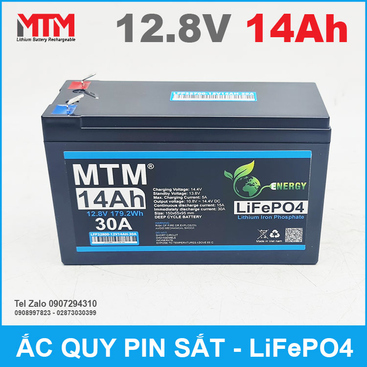 Bình ắc quy pin sắt LiFePo4 12V 14Ah 30A sử dụng mạch bảo vệ BMS có cân bằng cell pin. Đây là loại bình ắc quy được tích hợp bằng cell pin sắt LiFePo4 nên có tuổi thọ cao dung lượng lớn nhưng lại có trọng lượng nhẹ hơn so với bình ắc quy truyền thống. Loại ắc quy này đang được khách hàng ưu chuộng và sử dụng nhiều các lĩnh vực khác nhau như xe máy, xe điện, thiệt bị điện tử, hệ thống năng lượng mặt trời và nhiều ứng dụng khác. Không dùng bình này khởi động xe máy, ôtô, máy phát điện ….