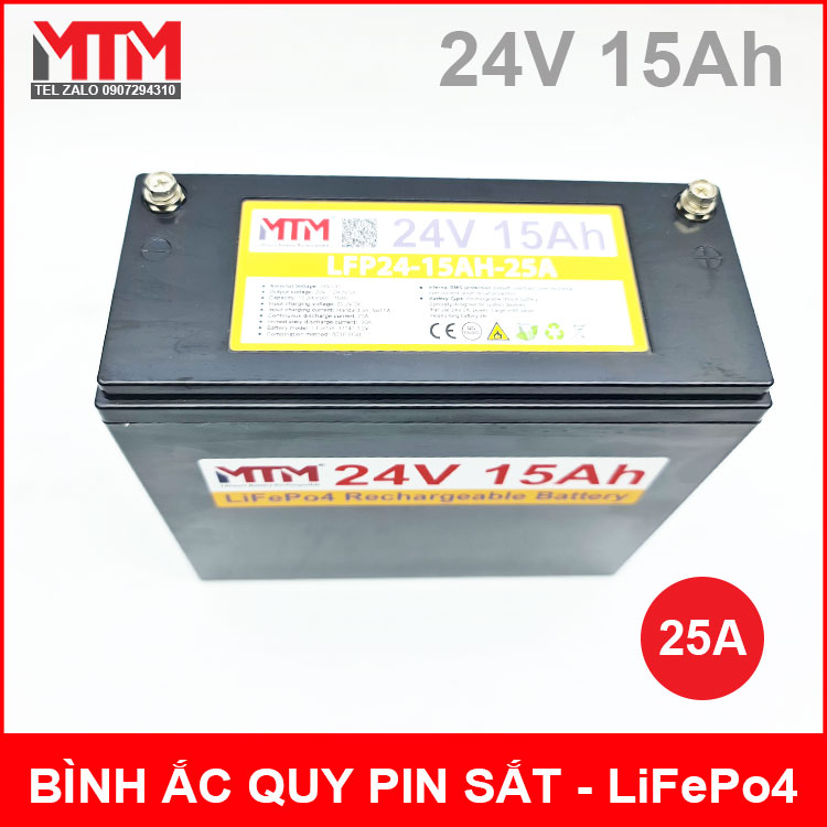 Bình ắc quy pin sắt LiFePo4 24V 15Ah 25A sử dụng mạch bảo vệ BMS Daly ổn định chịu tải tốt tuổi thọ cao. Đây là loại bình ắc quy được tích hợp bằng pin sắt LiFePo4 nên có tuổi thọ cao dung lượng lớn nhưng lại có trọng lượng nhẹ hơn so với bình ắc quy axit truyền thống. Loại ắc quy này đang được khách hàng ưu chuộng và sử dụng nhiều các lĩnh vực khác nhau như xe máy, xe điện, thiệt bị điện tử, hệ thống năng lượng mặt trời và nhiều ứng dụng khác.