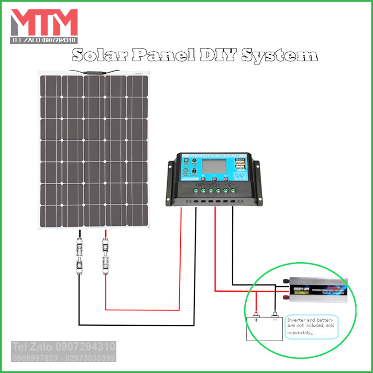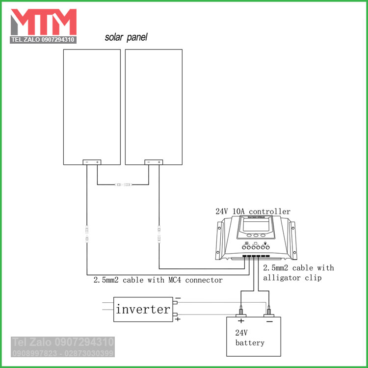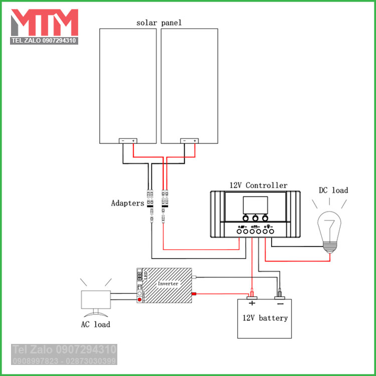 – Kết nối bình ắc quy, pin có điện thế phù hợp với hệ thống điện NLMT 12V hoặc 24V 36V 48V.