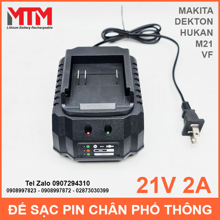 Đế sạc pin chân phổ thông Makita Dekton Hukan M21 VF 18V 21V 2A chuyên dùng để sạc các loại pin sạc 5S 18V 20V 21V máy khoan bắn vít máy mài máy cưa quạt đèn và nhiều thiết bị khác. Bộ sạc pin 21V tự động ngắt sạc khi pin đầy có đèn led báo.