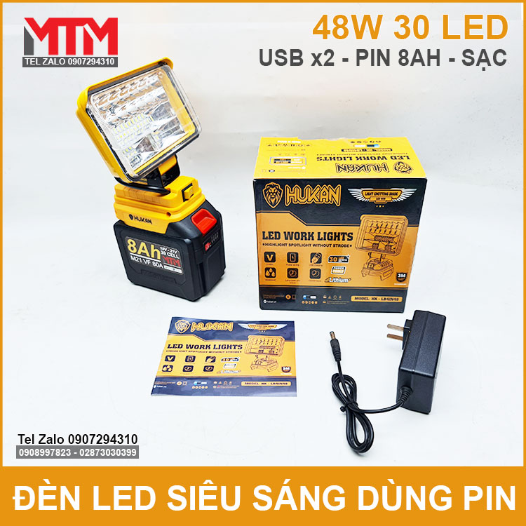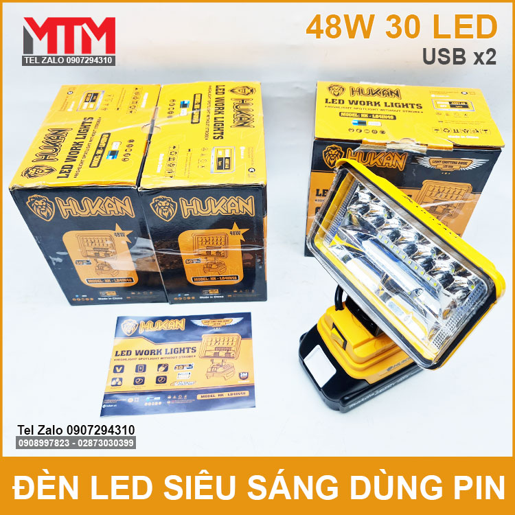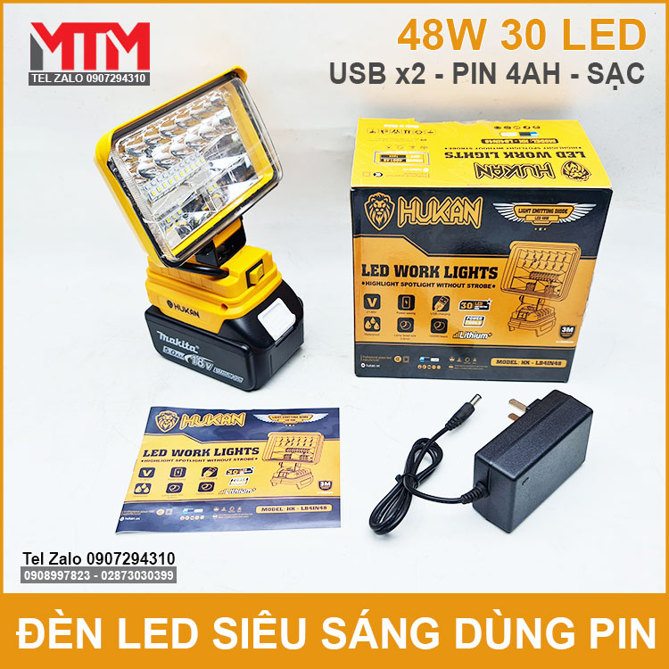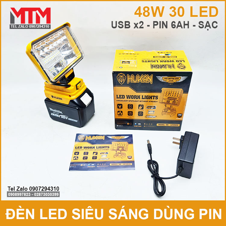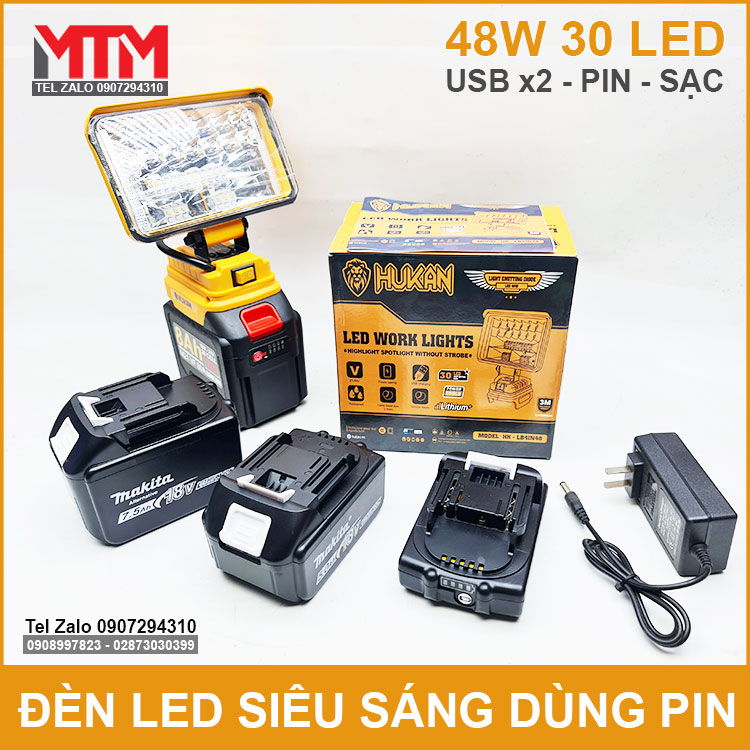 Đèn led siêu sáng dùng pin phổ thông Makita M21 VF 18V 21V 48W Hukan HK-LB4IN48 chính hãng sử dụng khẩn cấp cúp điện, chiếu sáng làm việc. Được thiết kế dùng 30 led siêu sáng công suất tối đa 48W, thân kim loại tàn nhiệt và nhựa ABS có thêm 2 cổng sạc USB.