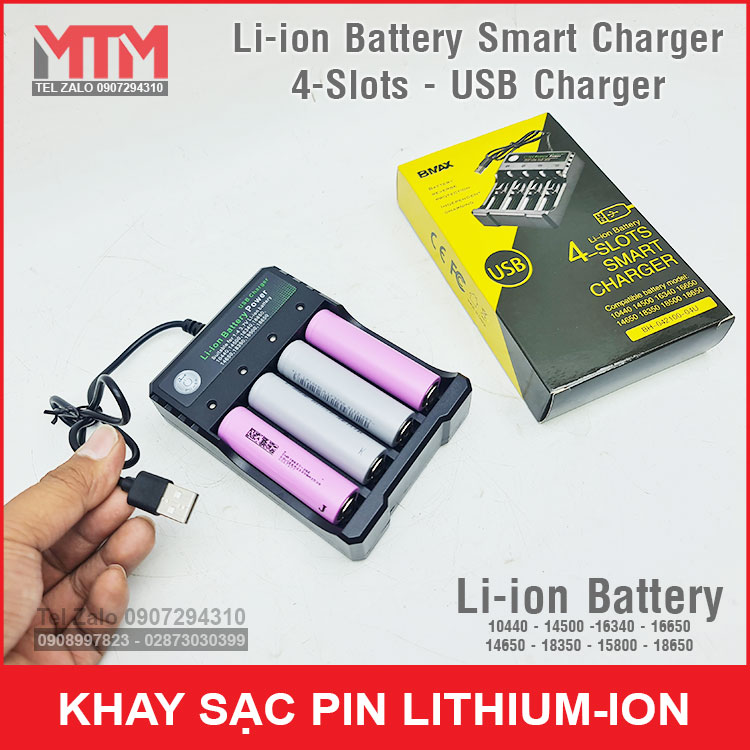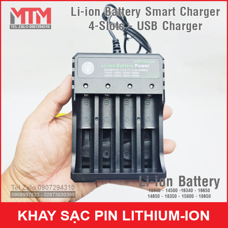 Khay sạc pin Lithium ion 4 khe sử dụng nguồn cổng sạc USB củ sạc điện thoại, pin sạc dự phòng. Bạn có thể sạc cho các loại pin Li-ion size 10440 14500 16340 16650 14650 18350 15800 18650 tiện lợi bảo vệ pin an toàn thông minh.