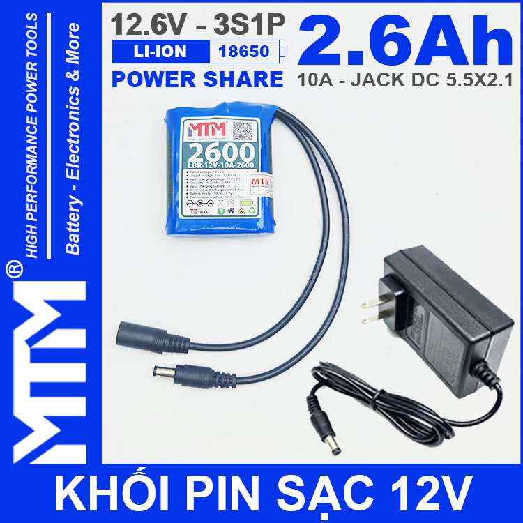Khối pin sạc Li-ion 12V 2.6Ah 10A 3S MTM – jack nguồn DC 5.5x21mm kèm sạc
