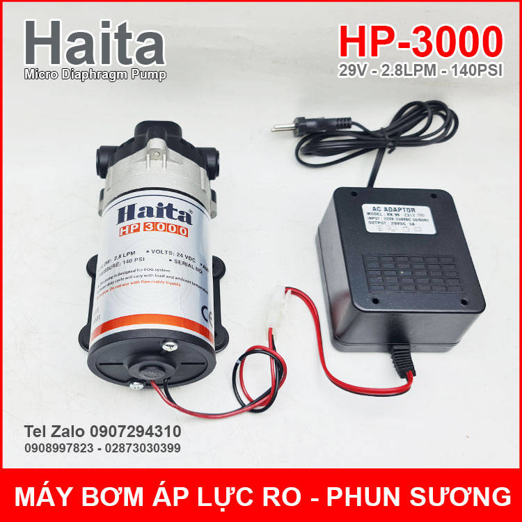 Phân phối máy bơm phun sương lọc nước RO 29V 2.8L 140PSI HP-3000 Haita kèm nguồn là loại máy bơm áp lực mini. Máy này hoạt động rất im và không bị nóng khi chạy liên tục thời gian dài sử dụng để phun sương làm mát quán cafe, phun sương nhà hàng, phun sương tưới Lan, phun tưới nhà nấm, rau mầm, nhà yến và bơm tăng áp trợ lực lọc nước RO.