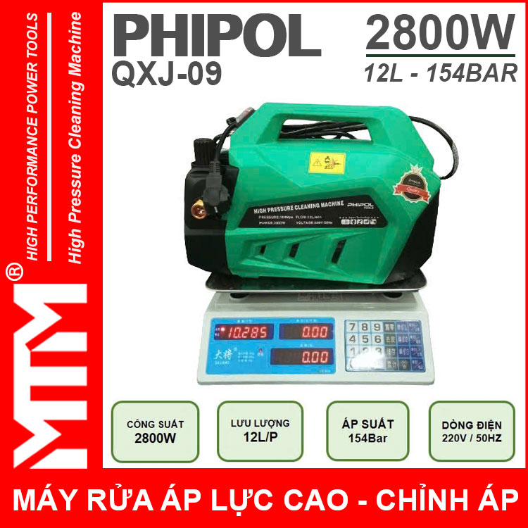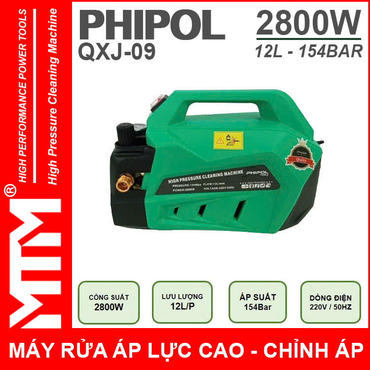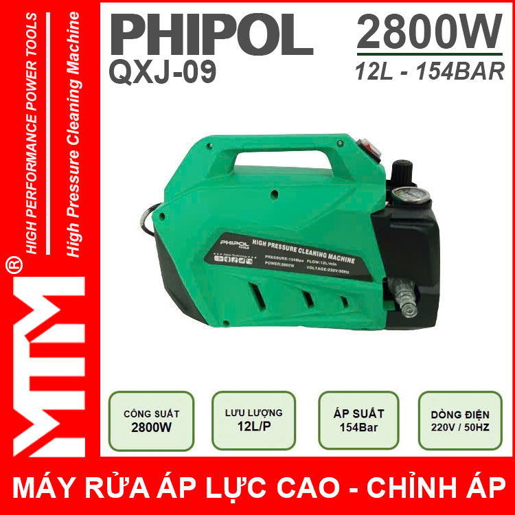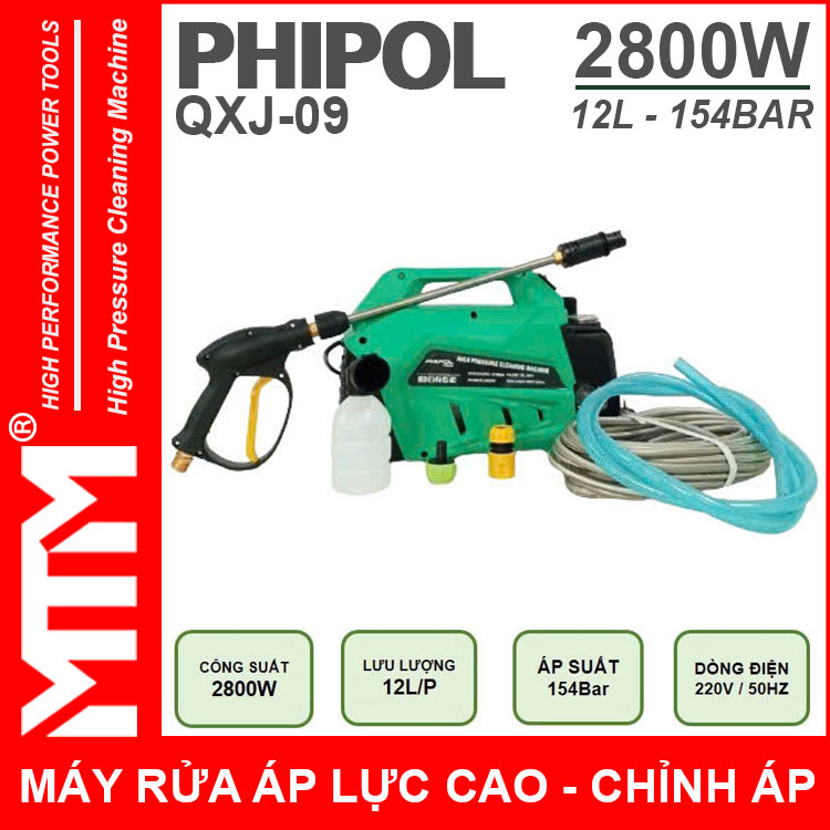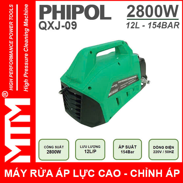 Máy xịt rửa áp lực cao 220V 2800W 154bar 12L Phipol QXJ-09 tự động có chỉnh áp chính hãng. Sử dụng vệ sinh máy lạnh, rửa xe máy ô tô gia đình, vệ sinh nhà hàng, xịt rửa sàn nhà, xịt rửa nhà cửa, vệ sinh vật dụng dụng cụ, phun xịt rửa máy móc thiết bị công nghiệp, phun xịt tưới cây nông nghiệp, phun xịt rửa chuồng trại chăn nuôi. Được sản xuất với công nghệ mới được khách hàng đánh giá cao về chất lượng, duy chuyển gọn nhẹ linh hoạt tiện lợi.