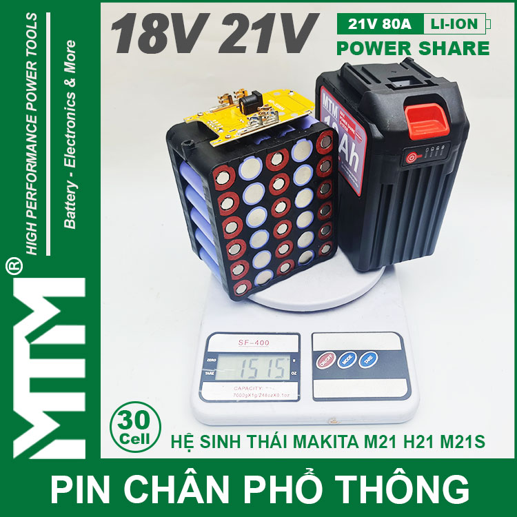 Pin chân phổ thông Makita 18V 21V 15Ah 30 cell mạch 80A led báo pin chống sốc