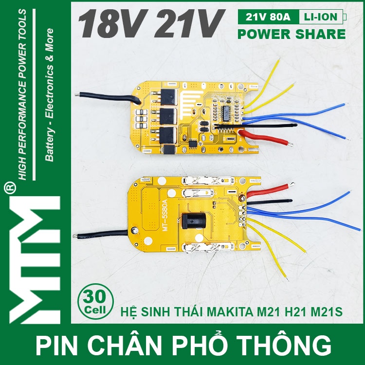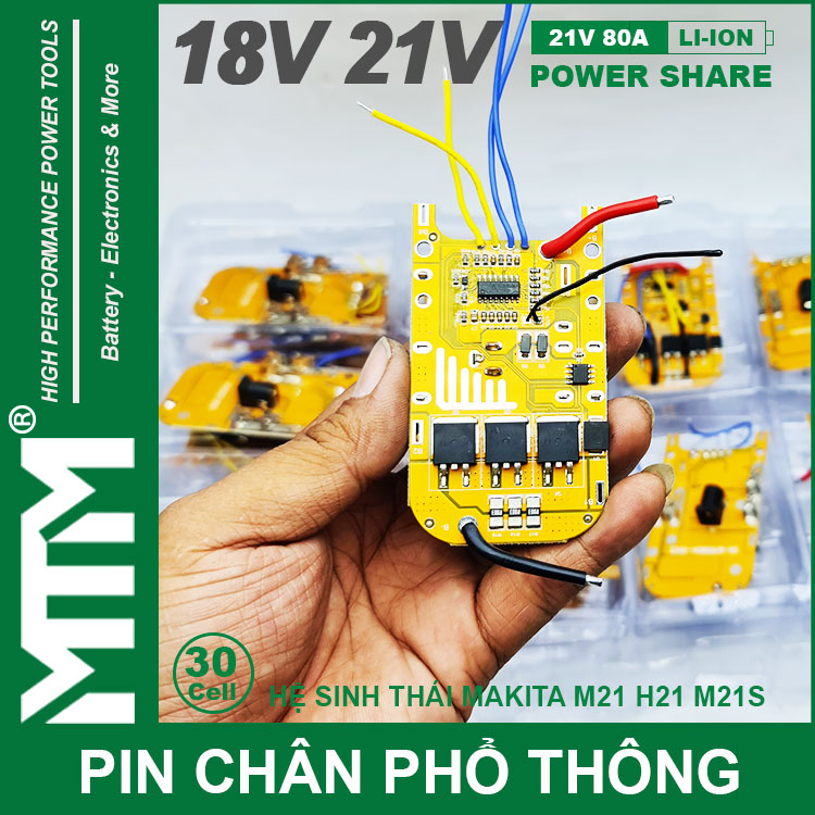 Pin chân phổ thông Makita 18V 21V 18Ah 30 cell mạch 80A led báo pin chống sốc