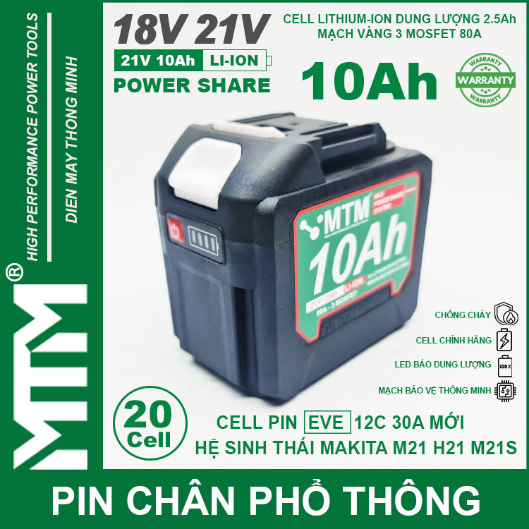Pin chân phổ thông Makita 18V 21V 2.5Ah 5 cell mạch 80A led báo pin chống sốc cell EVE 25P. Sử dụng cell Lithium-ion 18650 12C 30A EVE chính hãng chuyên dụng cho các thiết bị cầm tay chịu tải lớn dòng xả cao như bắn vịt, bắn bulong, máy khoan đục bê tông, máy mài, đèn, quạt dùng pin, máy thổi hút bụi và nhiều thiết bị cầm tay khác.