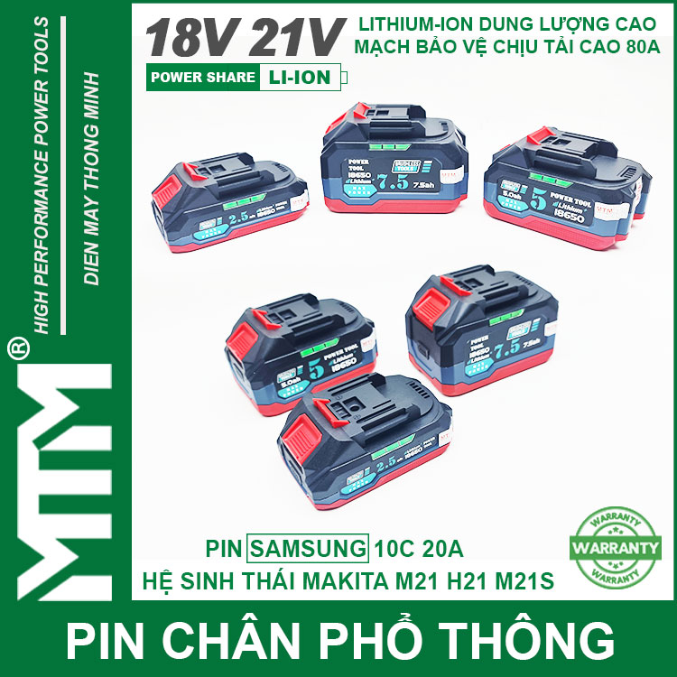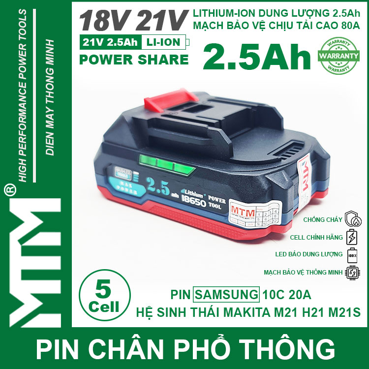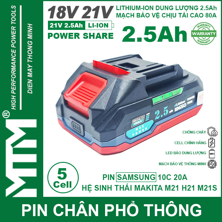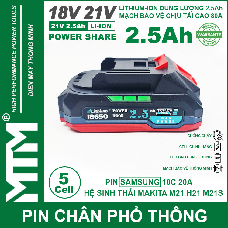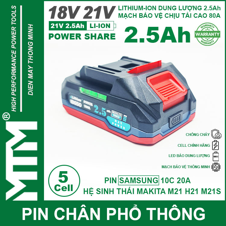Pin chân phổ thông Makita 18V 21V 2.5Ah 5 cell mạch 80A led báo pin chống sốc cell Samsung 25R. Sử dụng cell Lithium-ion 18650 10C 20A Samsung 25R chính hãng chuyên dụng cho các thiết bị cầm tay chịu tải lớn dòng xả cao như bắn vịt, bắn bulong, máy khoan đục bê tông, máy mài, đèn, quạt dùng pin, máy thổi hút bụi và nhiều thiết bị cầm tay khác.