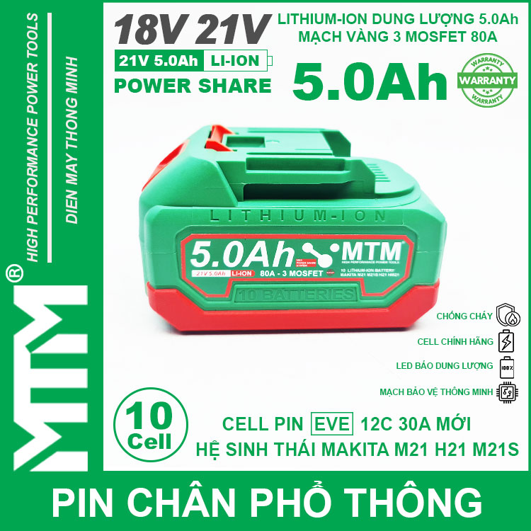 Pin chân phổ thông Makita 18V 21V 5.0Ah 10 cell mạch 80A led báo pin chống sốc cell EVE 25P. Sử dụng cell Lithium-ion 18650 12C 30A EVE chính hãng chuyên dụng cho các thiết bị cầm tay chịu tải lớn dòng xả cao như bắn vịt, bắn bulong, máy khoan đục bê tông, máy mài, đèn, quạt dùng pin, máy thổi hút bụi và nhiều thiết bị cầm tay khác.