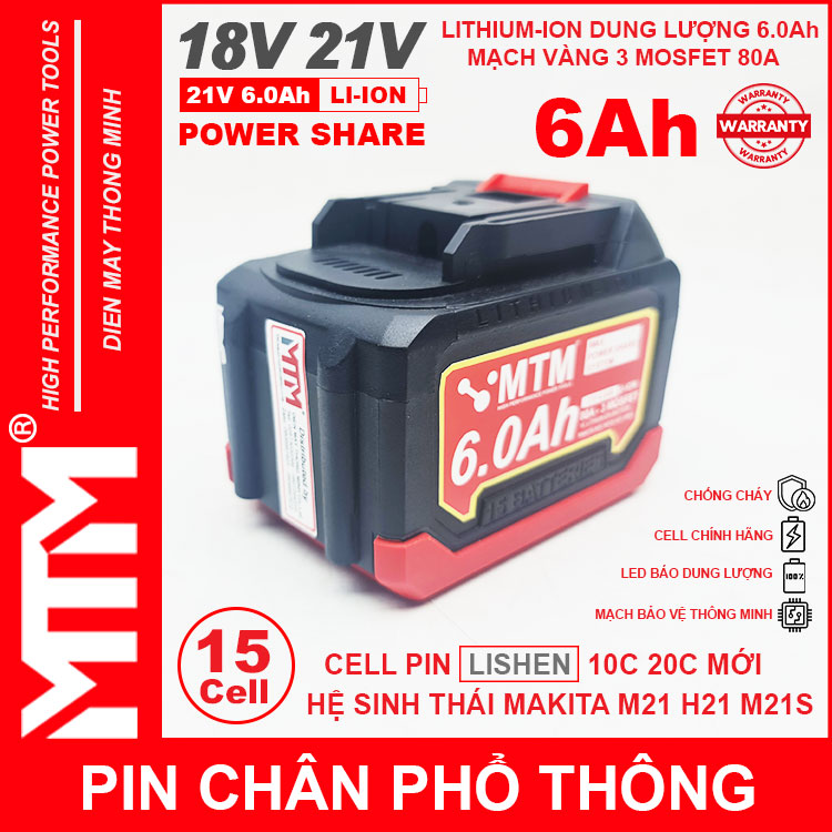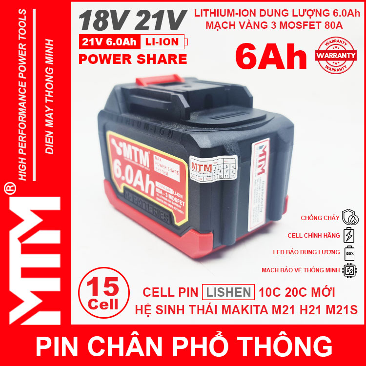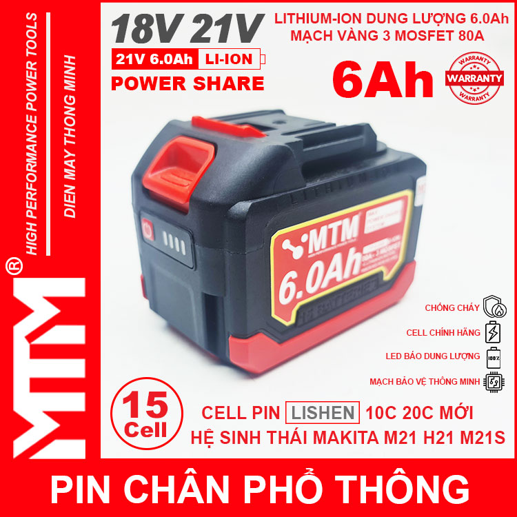 Pin chân phổ thông Makita 18V 21V 6Ah 15cell mạch 80A led báo pin chống sốc cell LISHEN. Sử dụng cell Lithium-ion 18650 10C 20A LISHEN chính hãng chuyên dụng cho các thiết bị cầm tay chịu tải lớn dòng xả cao như bắn vịt, bắn bulong, máy khoan đục bê tông, máy mài, đèn, quạt dùng pin, máy thổi hút bụi và nhiều thiết bị cầm tay khác.
