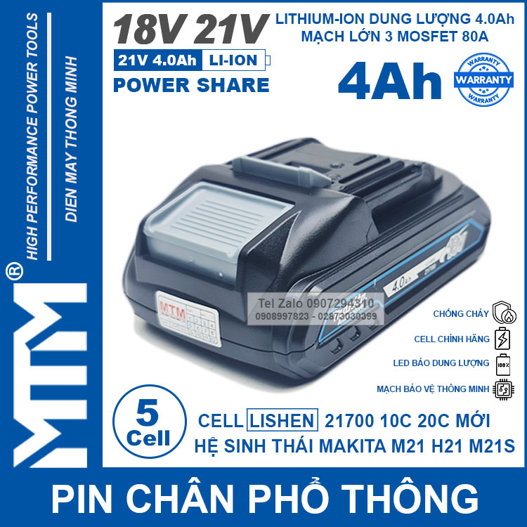Pin chân phổ thông Makita 18V 21V 8Ah 10 cell mạch 80A led báo pin cell Lishen 21700. Sử dụng cell Lithium-ion 21700 10C 20A LISHEN chính hãng chuyên dụng cho các thiết bị cầm tay chịu tải lớn dòng xả cao như bắn vịt, bắn bulong, máy khoan, đèn, quạt dùng pin….