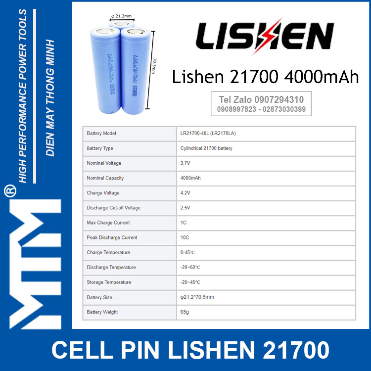 Cell Li-ion 21700 4.0Ah LISHEN chính hãng.