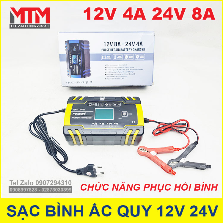 Phân phối sỉ và lẻ bộ sạc bình ắc quy tự động 12V 8A 24V 4A có chức năng phục hồi Foxsur chính hãng. Có thể sạc cho các loại bình 12V và 24V có dung lượng từ 6Ah đến 150Ah, tự động thông minh điều chỉnh dòng cường độ sạc và có chức năng phục phồi bình củ.