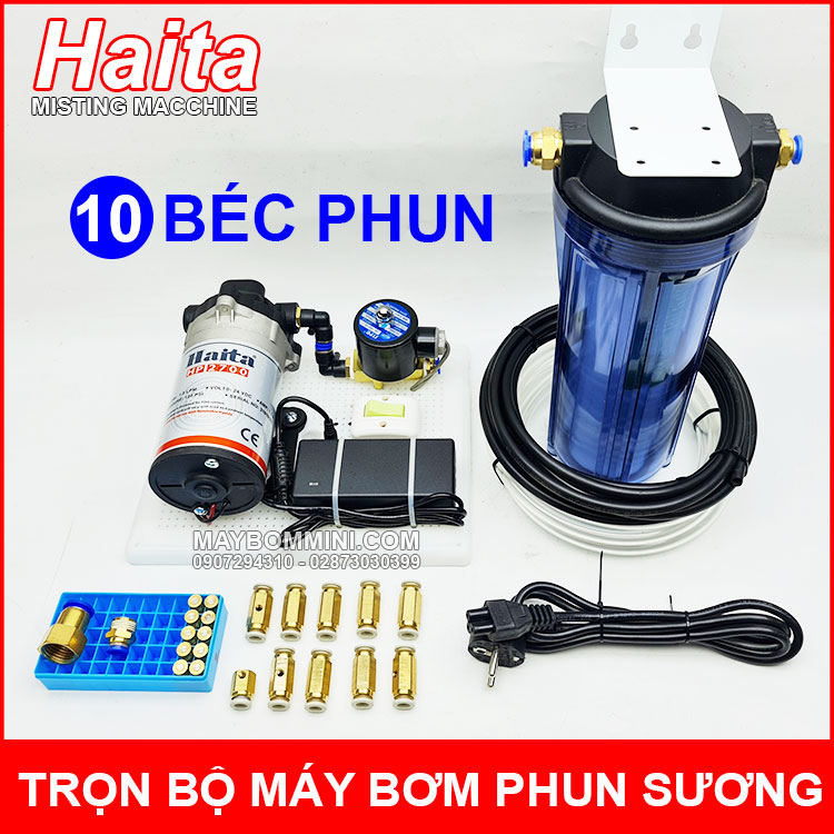 Trọn bộ máy bơm phun sương 10 béc HP-2700 Haita dùng phun sương làm mát, tưới cây tạo độ ẩm không khí. Máy này hoạt động rất im và không bị nóng khi chạy liên tục, có van điện từ khóa nước tự động khi ngưng hoạt động. Trọn bộ phun sương được lắp sẵn nên khi mua về khách hàng chỉ việc lắp ống phun, béc và cấp nước là sử dụng.